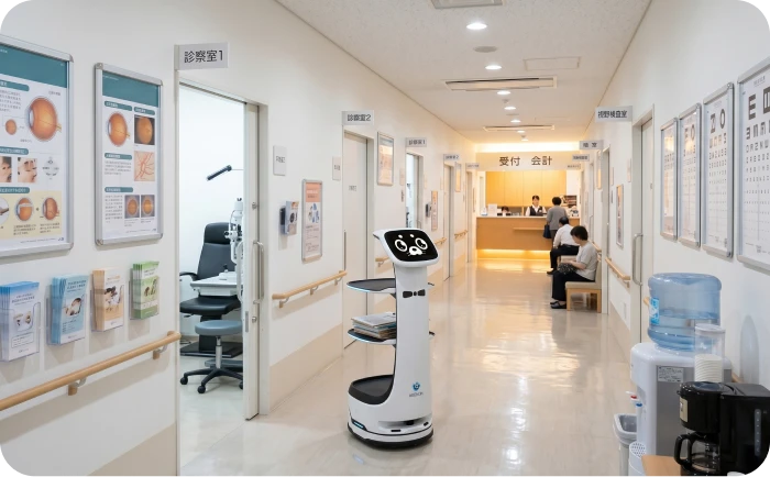 眼科や皮膚科などクリニックでは、配膳ロボットが処置室を会計を巡回し、カルテや書類などを運搬します。