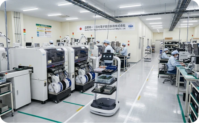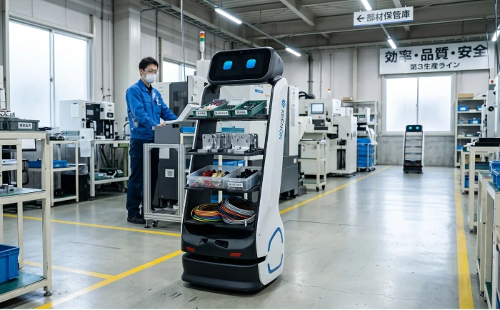 生産ラインで部材や製品の運搬をロボットで自動化します。作業者が移動する時間がなくなり、生産活動に集中することができます。また事務所から生産ラインに書類や備品の運搬にも活用されています。