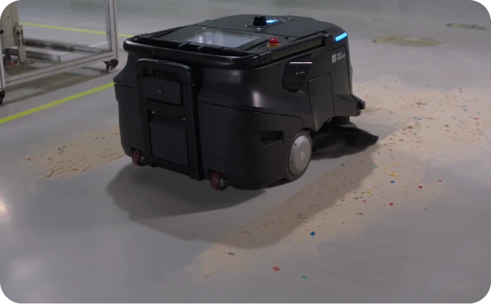 加工工程で発生する金属屑や粉塵、作業者の靴底に付着した汚れをロボットが清掃します。広大な通路や作業エリアを常にクリーンに維持。