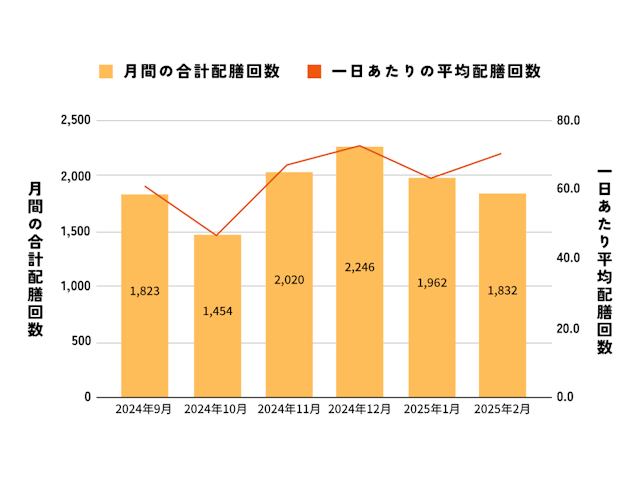 「チファジャ 甲府湯村店」では、ドリンクはセルフサービス方式だが、それ以外のメニューは基本的にT10で配膳している。下記グラフはT10の稼働データだが、1ヶ月あたり約2,000回、1日平均で約63回配膳を行っている。最多では、1日に199回も配膳する日もあった。