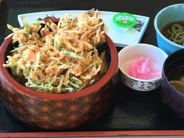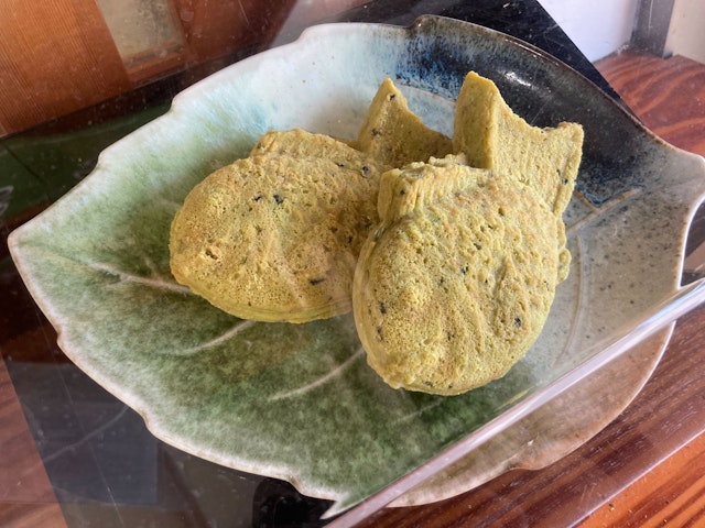 月日星は、静岡市の南部にある日本平山頂展望台のすぐ下でお土産販売も行う施設。施設内のレストランは180度ガラス張りで、景色を楽しみながら食事が楽しむことができる。観光客やファミリー層が多く訪れ、川根産の無農薬茶葉を生地に練り込んだ「お茶たい焼き」や桜エビや静岡県産茶葉を使用した「かき揚げそば」が人気のお店だ。