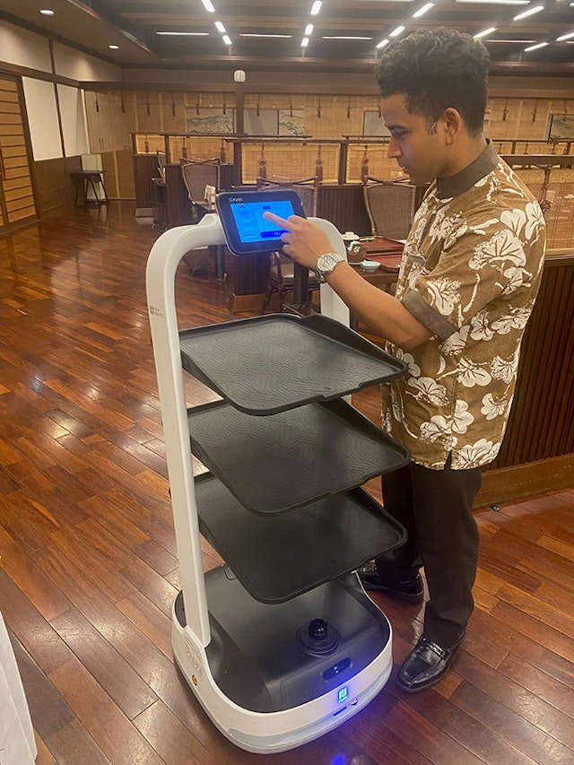 お客さまへ料理提供するのは従業員で行いたいと考えておりましたので、ロボットには調理場から食事処入り口までの約20メートルの間に料理を運ぶランナーとしての役割を任せています。何種類かの機体を試し、スピードや積載量の観点で『PuduBot 2』が最適でしたので導入に至りました。」
