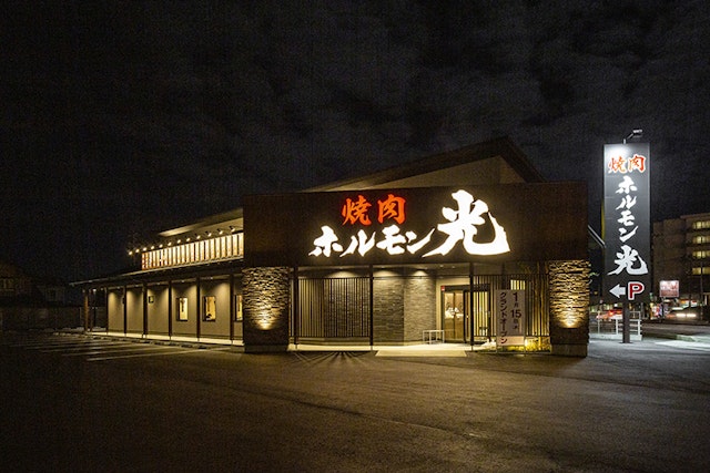 石川県に4店舗を構える焼肉屋、ホルモン光。松任店は石川県野々市に店を構える大型焼肉店で、席数132席の広い店内は歓送迎会やご家族のお食事などさまざまなシーンで活用しやすい店舗である。平日でも満席になる程の人気店で、メインメニューである鮮度の良いカルビやハラミを、ファミリーや学生向けに安価に提供している。名物のホソ焼きは特製のだしにつけて食べる。