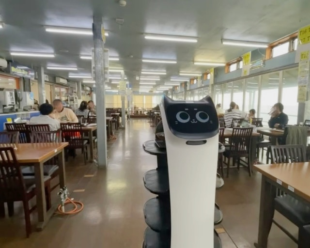 配膳ロボット8台を事故なく、スムーズに店舗で活用するためには、ロボット同士がお互いを感知し動くことが必要。DFAはネコ型配膳ロボット「Bella Bot(ベラボット)」へのプログラミングによって、店内全ての配膳ロボットが自動で連携する仕組みを作った。