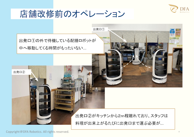 ただ、配膳ロボット8台をそのまま設置したとしても使い勝手や活用方法はピンと来ない。そこで、DFAは時間をおいて少数ずつ導入を提案し、徐々にスタッフ全員が活用できるオペレーションを作ることを提案した。