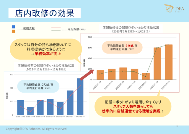 東芝テック、DFAとともに細かい設置調整・オペレーション変更を繰り返し、9、10台目の配膳ロボットを導入しても店舗のオペレーションを乱さず、効率はより向上できるのかという検証を終え、2023年5月から全10台の本導入を決定した。