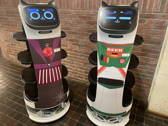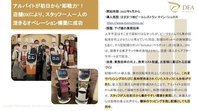 静岡県浜松市に店を構えるはままつ地ビールレストラン マイン・シュロスは、市内でも有数の出来立ての地ビールが飲めるレストラン。配膳ロボットに興味を持った事がきっかけで、ネコ型配膳ロボット「Bella Bot(ベラボット)」2台の導入を決定した。DFAは、提携する東芝テックのサポートを受けながら設置・導入を担当。結果、配膳ロボットはエンターテイメントとして活用されるだけでなく、新人教育の時間を削減し働くスタッフ一人一人が“即戦力”になるオペレーション構築にも寄与した。