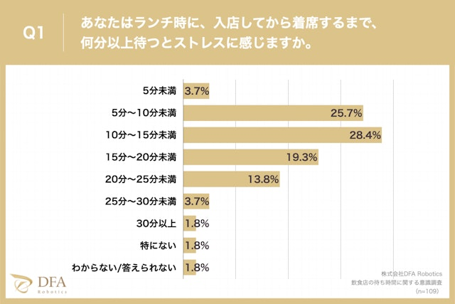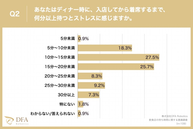 また、「ディナー時に、入店してから着席するまで、何分以上待つとストレスに感じるか?」という質問に対しても、「10〜15分未満」が最も多い結果になりました。