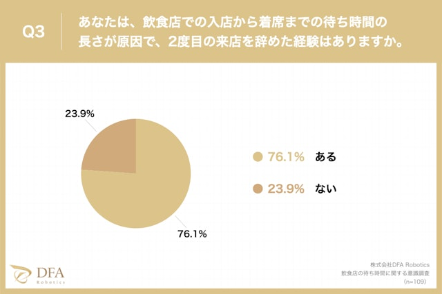 「飲食店での入店から着席までの待ち時間の長さが原因で、2度目の来店を辞めた経験はあるか?」という質問に対し、「ある」が76.1%、「ない」が23.9%という回答となりました。