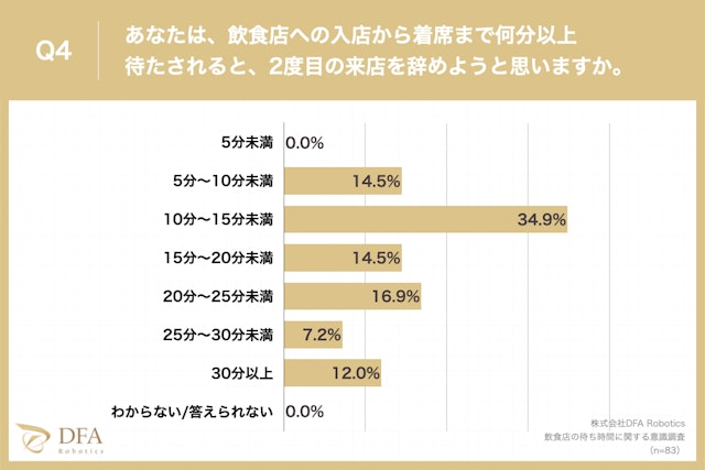 また、「ある」と回答した方に、「飲食店への入店から着席まで何分以上待たされると、2度目の来店を辞めようと思うか?」と質問したところ、「10分〜15分未満」が34.9%、「20分~25分未満」が16.9%、「5分~10分未満」が14.5%という回答となりました。