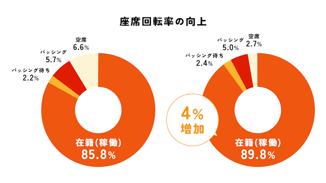 DFA Roboticsが実際に飲食店にてロボットあり/なしで比較したところ、空席が6.6%から2.7%へと変化、稼働率は4%アップしたケースもあります。