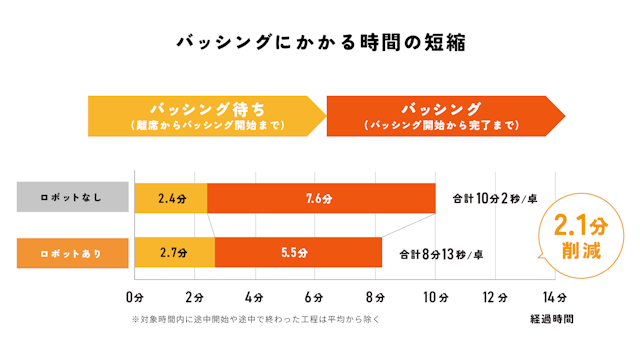 また、1テーブルあたりのバッシングにかかる時間は、ロボットありの場合は約2分削減されました。