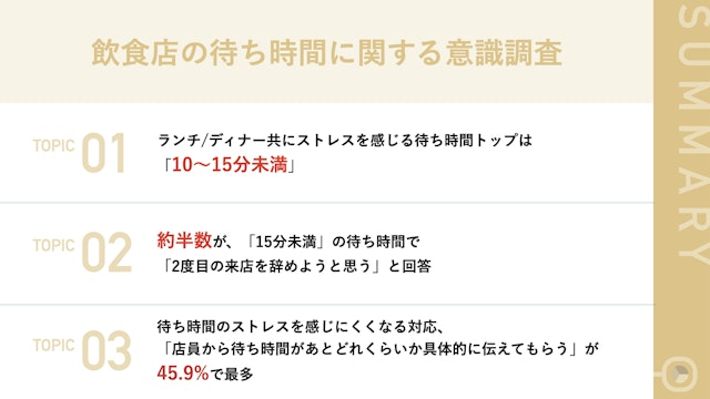 - Topic 01 ランチ時/ディナー時ともにストレスを感じる待ち時間トップは「10〜15分未満」