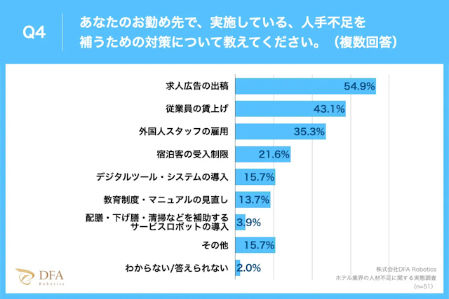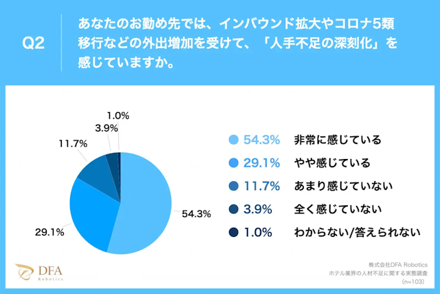 国内外からの旅行客増加によりホテル市場は需要の高まりを見せる一方で、コロナ禍で減ってしまった人材が戻らず人手不足に悩むホテルも多くあります。飲食店DXを推進するロボティクスソリューションカンパニーである株式会社DFA Robotics(本社:東京都渋谷区/代表取締役 波多野 昌昭)は、ホテル業界の人材不足に関する実態について、ホテルの管理職(支配人・マネージャー・部長職)103名を対象にアンケート調査を行い、その結果と共に「人材不足のホテル業界の需要対応のための解決策レポート」をお届けします。