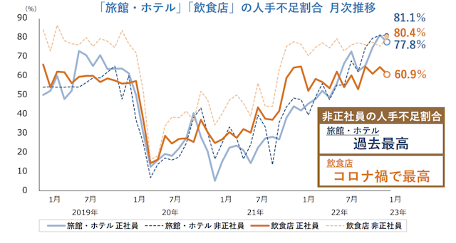 さらに、非正社員に関しても業種別の人手不足を感じる割合は「旅館・ホテル」「飲食店」がもっとも高く8割を超えています。これまで外国人人材で補ってきた部分も、コロナにより減った外国人労働者の戻りはまだ弱く、対応が難しい現状があります。