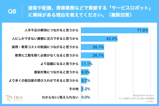 そのような現状の中、ホテルがサービスロボットに興味を示すもっとも多い理由は、やはり「人手不足の解消につながると思うから」です。さらに、人手不足が解消された結果、「人にしかできない業務に注力できると思う」「コミュニケーションが強化できそう」という副次的な効果を期待する声も見受けられています。