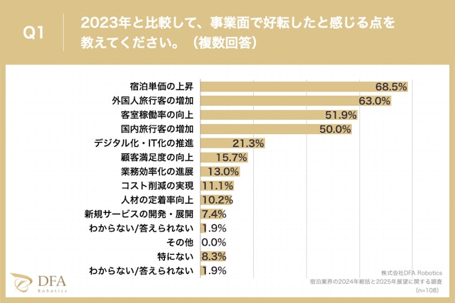 「あなたの施設において、2024年を振り返り2023年と比較して、事業面で好転したと感じることは何か?」という質問に対し、「宿泊単価の上昇」が68.5%、「外国人旅行客の増加」が63.0%、「客室稼働率の向上」が51.9%という回答となりました。