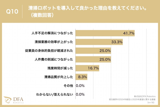 さらに、お勤め先に清掃ロボットが導入されて良かったと思うか、という問いに対して「とても良かった」「やや良かった」と回答した方に、その理由を質問した結果、「人手不足の解消につながった」が41.7%、「清掃業務の効率が上がった」が33.3%、「従業員の身体的負担が軽減された」が25.0%という回答となりました。