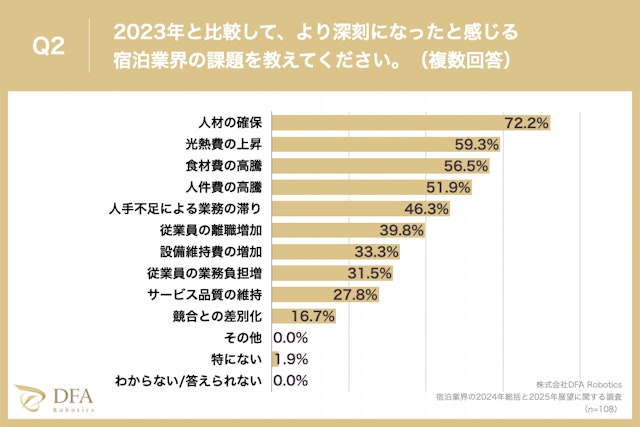 また「宿泊業界において、2024年を振り返り2023年と比較して、より深刻になったと感じる課題は何か?」と質問したところ、「人材の確保」が72.2%、「光熱費の上昇」が59.3%、「食材費の高騰」が56.5%という回答となりました。