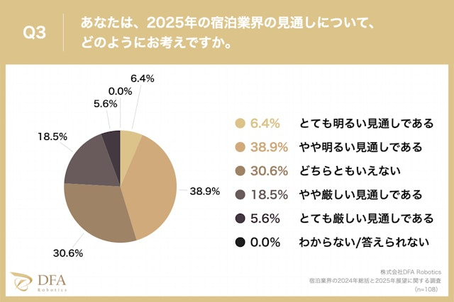 「2025年の宿泊業界の見通しについて、どのように考えているか?」という質問に対し、「とても明るい見通しである」が6.4%、「やや明るい見通しである」が38.9%で、明るい見通しであるという回答が約半数(45.3%)を占めています。