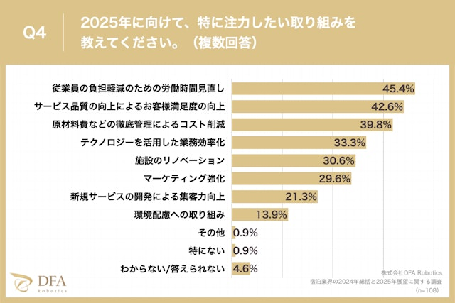 他にも「宿泊施設の運営において、2025年に特に注力したい取り組みは何か?」という問いに対して「従業員の負担軽減のための労働時間見直し」が45.4%、「サービス品質の向上によるお客様満足度の向上」が42.6%、「原材料費などの徹底管理によるコスト削減」が39.8%という回答となりました。