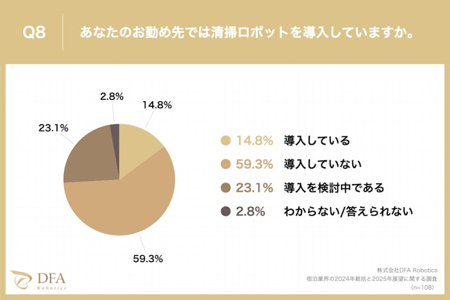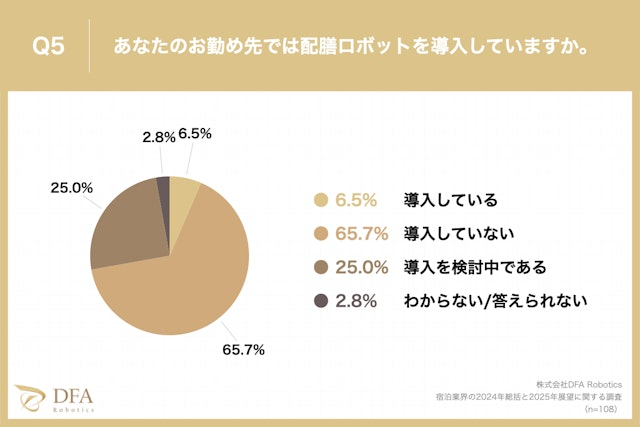 ロボティクスソリューションカンパニーである株式会社DFA Robotics(本社:東京都港区、代表取締役社長:松林 大悟)は、旅館・ホテルの管理職(支配人・マネージャー・部長職)108名を対象にアンケート調査を実施しました。