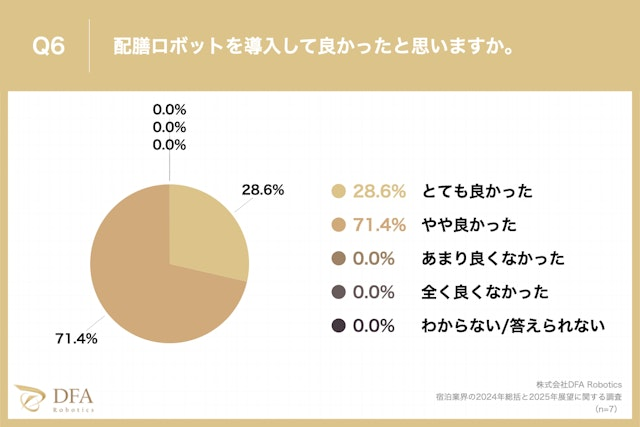 また、お勤め先に配膳ロボットを「導入している」と回答した方に、「配膳ロボットを導入して良かったと思うか?」と質問したところ、「とても良かった」が28.6%、「やや良かった」が71.4%で、全施設が導入して良かったと回答しました。