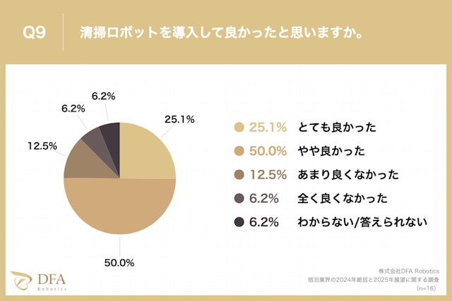 また、お勤め先に清掃ロボットを「導入している」と回答した方に、「清掃ロボットを導入して良かったと思うか?」と質問したところ、「とても良かった」が25.1%、「やや良かった」が50.0%で、7割以上(75.1%)が導入して良かったと回答しました。