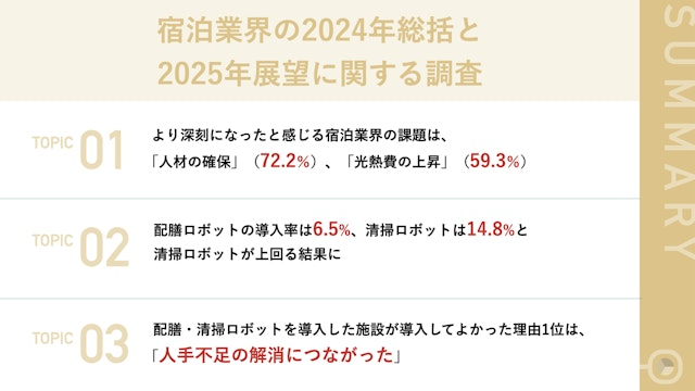 宿泊業界の2024年総括と2025年展望 「人材の確保」がより深刻に。人手不足対策としてロボットの導入率も調査 〜配膳・清掃ロボットの導入率は宿泊業界ならではの結果に〜