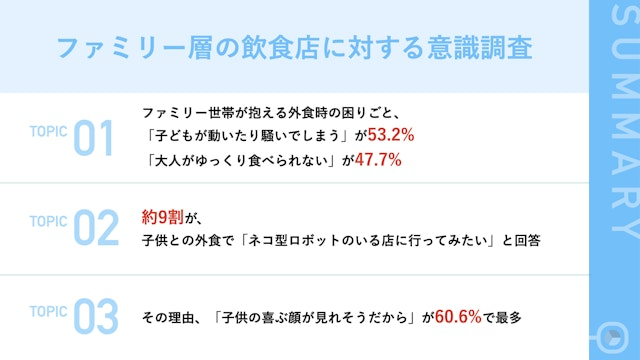 ネコ型配膳ロボットの存在が、子供へのポジティブな影響を及ぼし、ファミリー層が訪れたいと思う一因となっていることが判明し、ファミリー層の飲食店選びにおいて、「ネコ型配膳ロボット」をはじめとするさまざまなサービスロボットが接客してくれる飲食店は、今後さらに世代を問わず支持される存在になると言えます。