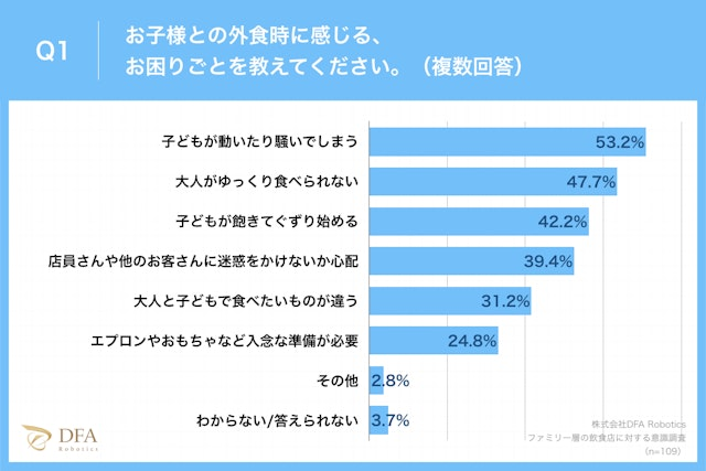 1歳以上〜小学生以下の子どものいる親109名を対象に実施したアンケート調査において「お子様との外食時に感じる、お困りごとは何があるか?」という質問に対し、「子どもが動いたり騒いでしまう」が53.2%、「大人がゆっくり食べられない」が47.7%、「子どもが飽きてぐずり始める」が42.2%という回答になりました。