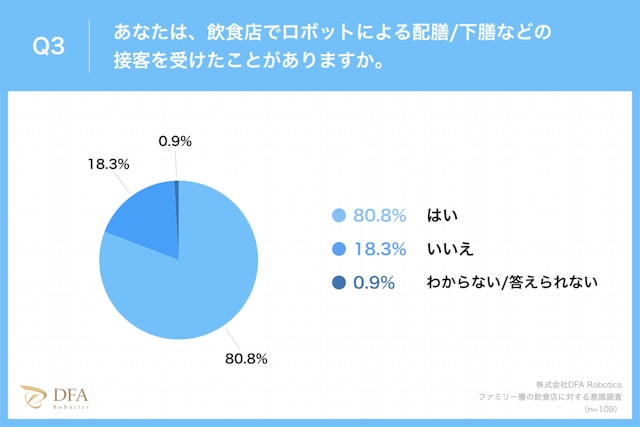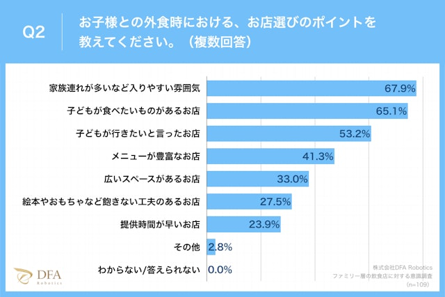 飲食店DXを推進するロボティクスソリューションカンパニーである株式会社DFA Robotics(本社:東京都渋谷区恵比寿 代表取締役:波多野昌昭)は、ファミリー層の飲食店に対する意識調査について1歳以上〜小学生以下の子どものいる親109名を対象にアンケート調査を行い、その結果と共に店舗運営の実態および配膳ロボット導入について「ファミリー層の飲食店に対する意識調査レポート」を発表したことをお知らせいたします。