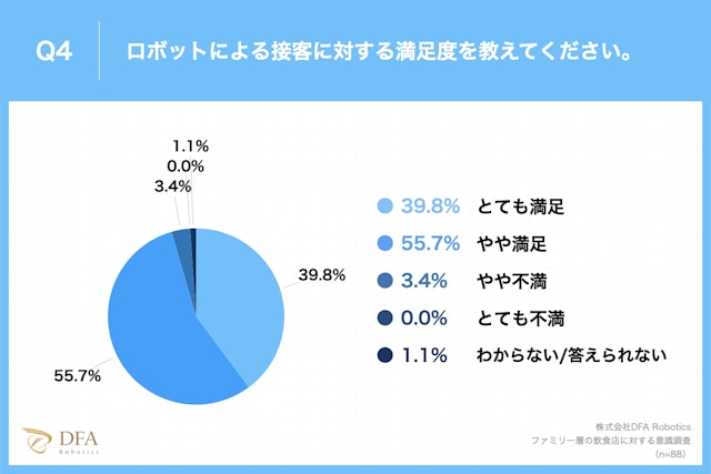 「ロボットでの配膳/下膳を受けたことがあるか?」という質問に対し、「はい」が80.8%、「いいえ」が18.3%という回答となりました。また、「ロボットによる接客を受けたことがある」(「はい」)と回答した方に、「ロボットによる接客に満足しているか?」という質問に対し、「とても満足」が39.8%、「やや満足」が55.7%と95.5%がロボットでの配膳/下膳に満足していることがわかりました。