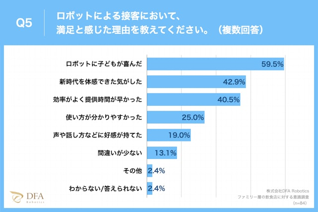 中でも、「ロボットによる接客に満足している」(「とても満足」「やや満足」)と回答した方に、その理由について質問したところ約6割の59.5%が「ロボットに子どもが喜んだ」、42.9%が「新時代を体感できた気がした」、40.5%が「効率がよく提供時間が早かった」と回答しました。