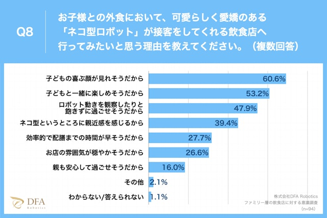 さらに、86.2%の約9割が子供との外食で「ネコ型配膳ロボット」のいる店に行ってみたいと思っていることが明らかになり、理由としては60.6%が「子どもの喜ぶ顔が見れそうだから」、53.2%が「子どもと一緒に楽しめそうだから」という理由が見受けられました。