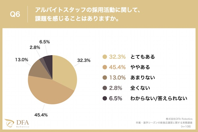 飲食店DXを推進するロボティクスソリューションカンパニーである株式会社DFA Robotics(本社:東京都渋谷区恵比寿、代表取締役:波多野昌昭)は、10名以上のアルバイトスタッフを雇っている、飲食店の店長・店舗責任者108名を対象にアンケート調査を実施しました。