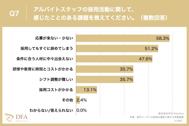 一方で、約8割にあたる77.7%が、アルバイトスタッフの採用活動に課題を感じており、具体的な課題としては、「応募が来ない・少ない」(58.3%)、「採用してもすぐに辞めてしまう」(51.2%)などが挙げられています。