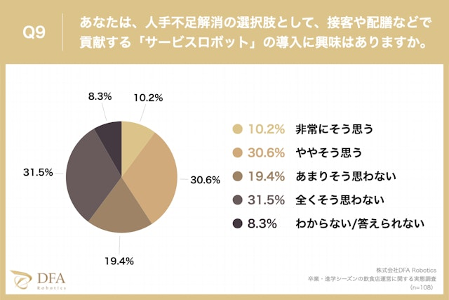 「人手不足解消の選択肢として、接客や配膳などで貢献する「サービスロボット」の導入に興味はあるか?」という質問に対し「非常にそう思う」が10.2%、「ややそう思う」が30.6%という回答となりました。