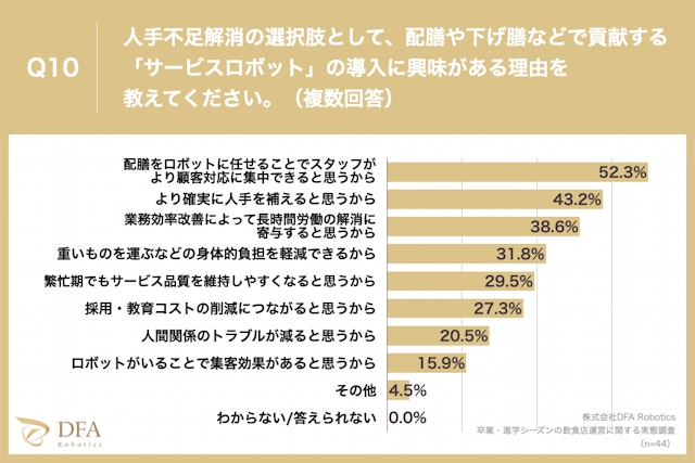 さらに、40.8%が人手不足への対策として「サービスロボット」の導入に興味を示しており、「配膳をロボットに任せることでスタッフがより顧客対応に集中できると思うから」(52.3%)、「より確実に人手を補えると思うから」(43.2%)などの声が寄せられました。