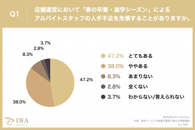 「店舗運営において『春の卒業・進学シーズン』によるアルバイトスタッフの人手不足を危惧することがあるか?」という質問に対し「とてもある」が47.2%、「ややある」が38.0%という回答になりました。