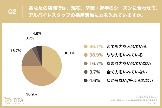 「現在、卒業・進学のシーズンに合わせて、アルバイトスタッフの採用活動に力を入れていますか?」という質問に対し「とても力を入れている」が36.1%、「やや力をいれている」が38.9%という回答となりました。