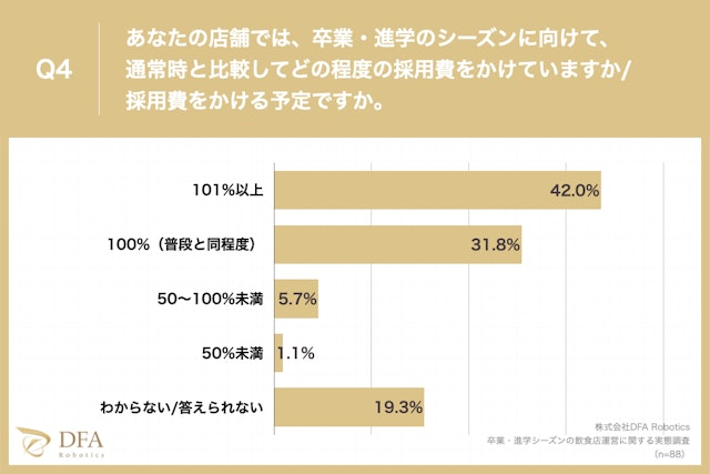 さらに、Q3で「採用費はかけていない」以外を回答した方に「卒業・進学のシーズンに向けて、通常時と比較してどの程度の採用費をかけているか/採用費をかける予定か?」と質問したところ、普段よりも採用費をかける(101%以上)と回答した割合が42.0%という結果になりました。