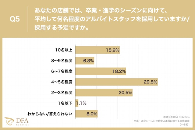 続いて、同じくQ3で「採用費はかけていない」以外を回答した方に「卒業・進学のシーズンに向けて、平均して何名程度のアルバイトスタッフを採用しているか/採用する予定か?」と質問したところ「4~5名程度」が29.5%、「2~3名程度」が20.5%、「6~7名程度」が18.2%という回答となりました。