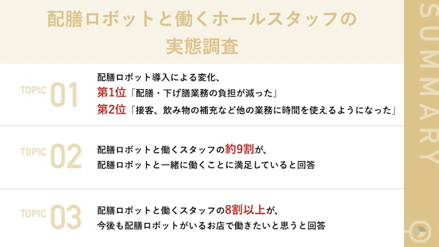 ・Topic 02:配膳ロボットと働くスタッフの約9割が、配膳ロボットと一緒に働くことに満足していると回答