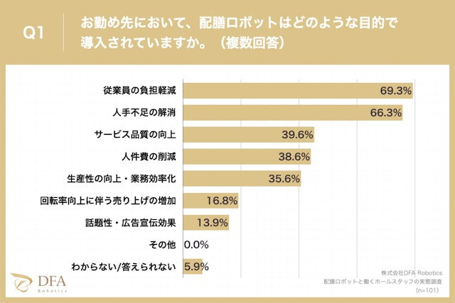 今回のアンケート調査により、配膳ロボットと一緒に働いている、飲食店のホールスタッフ101名に、配膳ロボットはどのような目的で導入されているか質問したところ、69.3%が「従業員の負担軽減」、次いで66.3%が「人手不足の解消」と回答し、配膳ロボットは従業員のより働きやすい環境の実現や労働力確保のために導入されていることがわかりました。