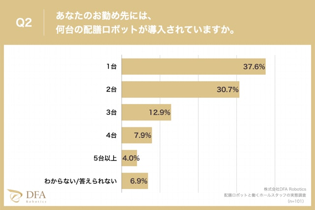 「あなたのお勤め先には、何台の配膳ロボットが導入されていますか?」という質問に対し「1台」が37.6%、「2台」が30.7%、「3台」が12.9%という回答となりました