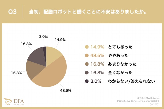 「当初、配膳ロボットと働くことに不安はあったか?」という質問に対し、「とてもあった」が14.9%、「ややあった」が48.5%という回答となりました。