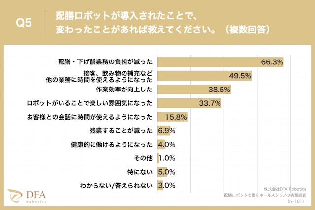 「配膳ロボットが導入されたことで、変化したことはあるか?」という質問に対し「配膳・下げ膳業務の負担が減った」が66.3%、「接客、飲み物の補充など他の業務に時間を使えるようになった」が49.5%、「作業効率が向上した」が38.6%という回答となりました。