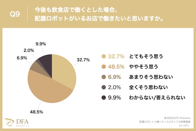 「今後も飲食店で働くとした場合、配膳ロボットがいるお店で働きたいと思いますか。」という質問に対し、「とてもそう思う」が32.7%、「ややそう思う」が48.5%という回答となりました。