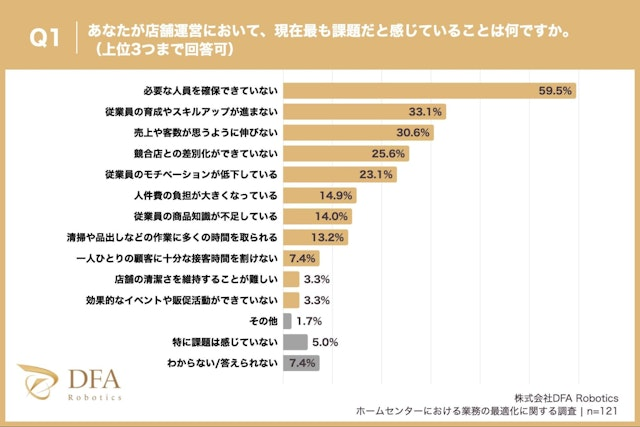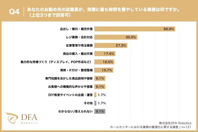 配膳・清掃・搬送ロボットで、あらゆる業界のDXを推進する株式会社DFA Robotics(本社:東京都港区、代表取締役社長:松林 大悟)は、ホームセンターに勤務している方121名を対象にアンケート調査を実施しました。